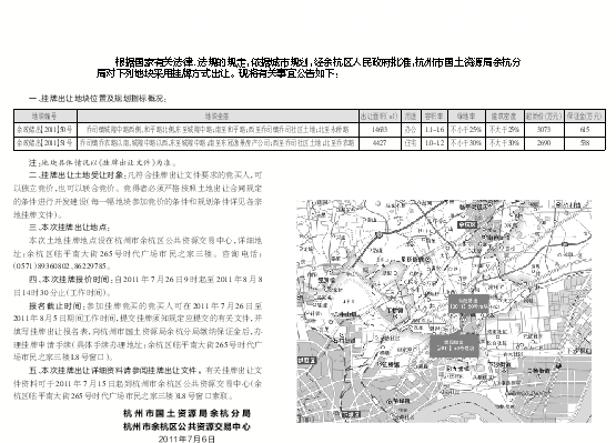 五、本次挂牌出让详细资料请参阅挂牌出让文件。有关挂牌出让文件资料可于2011年7月15日起到杭州市余杭区公共资源交易中心(余杭区临平南大街265号时代广场市民之家三楼)L8号窗口索取。