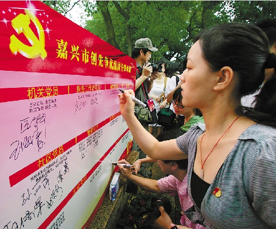 嘉兴市党员干部开展以“作出一次先锋承诺、重温一次入党誓词”等为内容的“七个一”活动。 记者 邵全海 胡元勇 摄