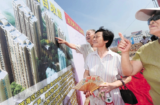 7月2日,合肥市瑶海区双窑洞棚户区改造项目开工,搬迁群众许国芳(中)等在参观项目建成后的效果图。 新华社发