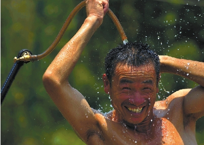 来自江苏徐州的电焊工、党员闫明成下班后的第一件事,就是用凉水冲澡降温。