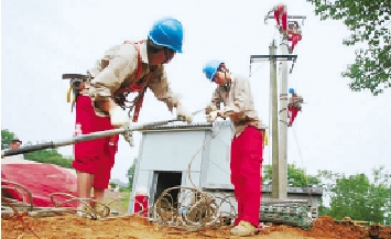 日前,安吉县梅溪供电营业所抢修人员正在架设一台80千伏安变压器,以应对用电高峰。 通讯员 夏鹏飞 金玮 摄
