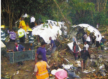 7月8日,在刚果(金)基桑加尼,救援人员在坠机现场工作。刚果(金)运输部8日发表声明说,当天基桑加尼国际机场附近发生的空难事故已导致127人死亡,但有51人在这次空难中生还。 新华社发
