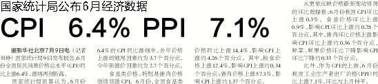 据新华社北京7月9日电 (记者 刘铮) 国家统计局9日发布报告,6月份全国居民消费价格总水平(CPI)同比上涨6.4%,涨幅再创新高。
