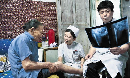 临海市第二人民医院组织党员医务人员来到杜桥镇麻车村,回访87岁的患者李荷花,为老人听诊把脉,询问康复情况,并将一批药品免费赠送给老人。