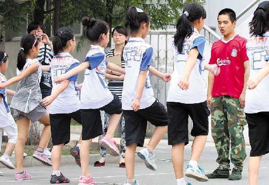 7月10日,杭州夏令营的小朋友在武警浙江总队直属支队进行队列训练,体验警营生活。