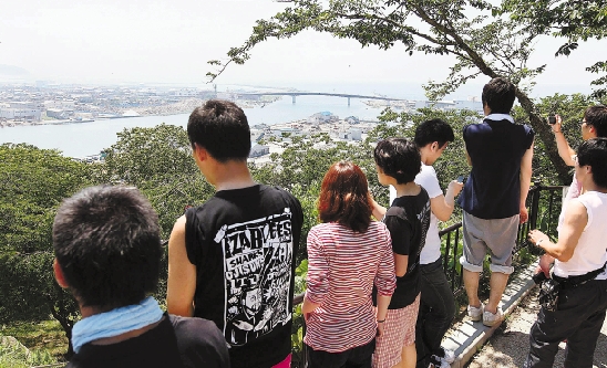 7月10日,在日本宫城县石卷湾,在海啸预警发布以后,人们聚集在一座山上观看远处水面可能发生的变化。 新华社发