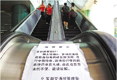 | 7月11日,深圳地铁罗宝线罗湖站的扶梯张贴着停运提示。7月10日,深圳地铁4号线清湖站的上行扶梯突然发生意外,造成多名乘客受伤。目前,深圳地铁340部奥的斯513MPE自动电扶梯已全部暂停使用。 新华社记者 刘大伟 摄 |