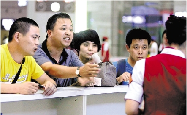 | 7月12日,一些乘坐京沪高铁的旅客在上海虹桥火车站咨询退票事宜。当日11时,京沪高铁宿州附近因供电设备故障,造成部分列车晚点,13时故障处理完毕,晚点列车逐步恢复运行,截至记者发稿时,仍有不少乘客滞留在候车大厅。 新华社记者 陈飞 摄 |