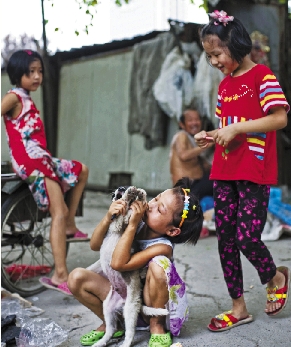 几天下来,安徽女孩卢传菊和爷爷养的“小花子”有了感情,正在教训“小花子”要改掉钻垃圾箱的毛病。