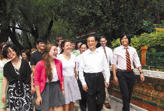 胡锦涛主席在瀛台林荫路上同佩顿中学师生们亲切交谈。 新华社记者 兰红光 摄