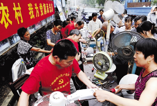 昨日,杭州塘栖镇“叫响我是共产党员”主题服务活动走进该镇宏畔村,来自镇医院、电信、房管所等10多个部门的90多位党员志愿者,为村民提供电器修理、缝纫修补等服务。 本报记者 梁臻 摄