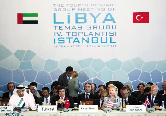 7月15日,在土耳其伊斯坦布尔,美国国务卿希拉里·克林顿(前右二)、英国外交大臣威廉·黑格(前右一)、土耳其外交部长达武特奥卢(前左二)和阿拉伯联合酋长国外长谢赫阿卜杜拉(前左一)出席利比亚问题联络小组第四次会议。 新华社发