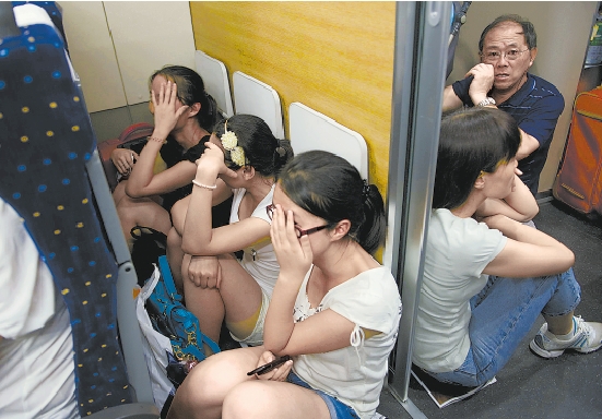 7月18日,由杭州开往上海虹桥的动车D5664次出现故障而取消,近200名旅客改乘G7326次高铁,造成车厢拥堵。图为高铁车厢内席地而坐的旅客。