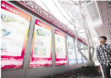 和平会展中心门口的杭州市公共租赁住房项目展区内,市民前来参观。吴煌 摄