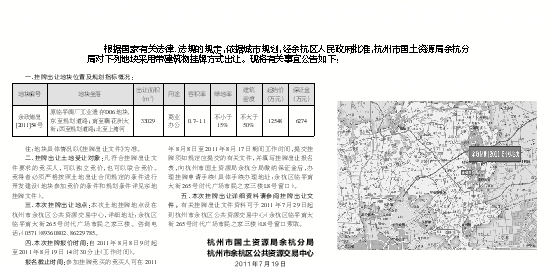 五、本次挂牌出让详细资料请参阅挂牌出让文件。有关挂牌出让文件资料可于2011年7月29日起到杭州市余杭区公共资源交易中心(余杭区临平南大街265号时代广场市民之家三楼)L8号窗口索取。