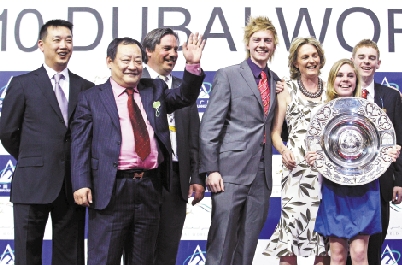 2010年3月27日广厦集团赞助迪拜赛马世界杯比赛,图为集团董事局主席楼忠福先生为冠军获得者颁奖。
