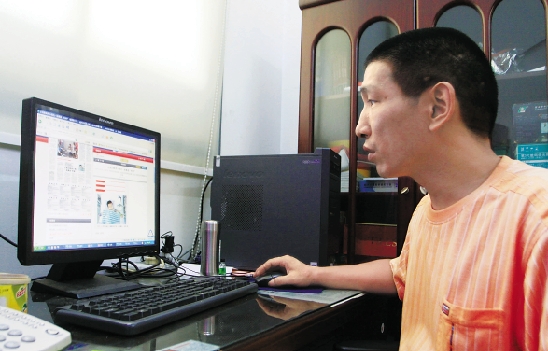 金梁辉在电脑前关注小伟杰病情的新闻。 刘伟 摄