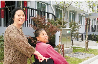 今年入住临海廉租房小区景莲公寓的市民张云琴正悠闲地推着爱人一起散步。 施晓义 摄