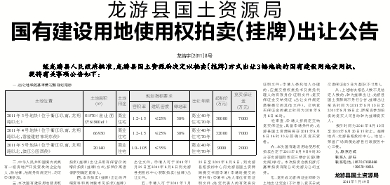 八、上述地块报名人数不足法定人数的,转为挂牌出让,龙游县国土资源局不另行公告,挂牌出让报名时间为2011年8月10日至2011年8月18日止,原报名参加拍卖的竞买人可自动转为挂牌竞买人。