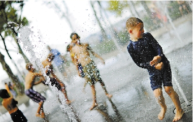 7月22日,儿童在美国纽约炮台公园的喷泉中玩耍。当日,纽约市最高气温达到39摄氏度,成为今年入夏以来最热的一天。 新华社记者 申宏 摄