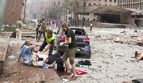 7月22日,一名受伤男子在挪威首都奥斯陆爆炸现场等待救援。 新华社发
