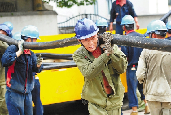 7月23日,杭城白天最高气温达35℃,杭州城北变电所的30多名电力工人正冒着酷暑铺设一条高压电缆。 本报记者 吴元峰 摄