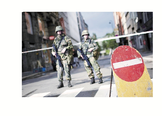 7月23日,在挪威首都奥斯陆,士兵在政府办公大楼前警戒。 新华社发