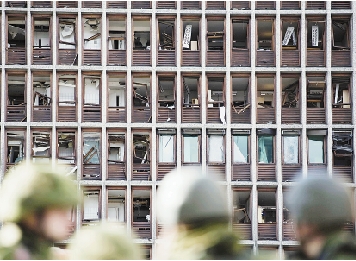 7月23日,在挪威首都奥斯陆,士兵在政府办公大楼前警戒。