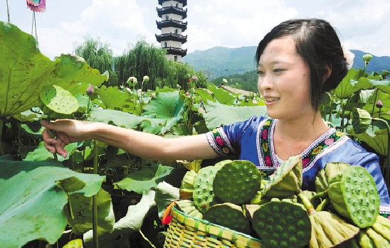 武义县柳城畲族镇的莲农在采摘当地特产宣莲。宣莲种植历史有1350多年,以其质佳味美而与福建建莲、湖南湘莲称为中国三大莲子。 张建成 摄