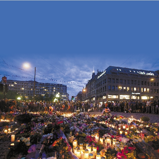7月23日,在挪威首都奥斯陆大教堂外的广场上,人们点亮蜡烛,摆上鲜花,悼念袭击事件中的遇难者。 新华社发