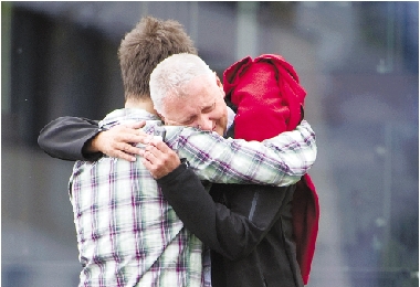 7月23日,在挪威首都奥斯陆,一位于特岛枪击案生还者与其父亲拥抱。