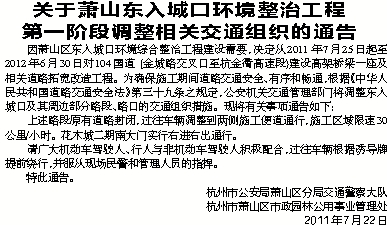 因萧山区东入城口环境综合整治工程建设需要,决定从2011年7月25日起至2012年6月30日对104国道 (金城路交叉口至杭金衢高速段)建设高架桥梁一座及相关道路拓宽改造工程。为确保施工期间道路交通安全、有序和畅通,根据《中华人民共和国道路交通安全法》第三十九条之规定,公安机关交通管理部门将调整东入城口及其周边部分路段、路口的交通组织措施。现将有关事项通告如下: