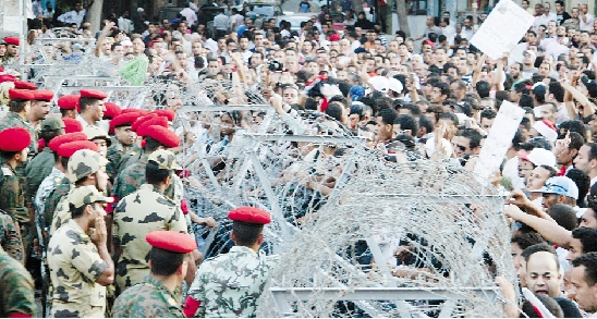 7月23日,在埃及首都开罗的阿巴西耶区,军警在道路上设置铁丝网阻止抗议者。开罗当日因抗议活动引发暴力冲突,导致231人受伤,其中39人被送往医院治疗。
