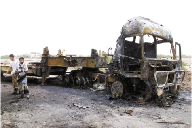 7月24日,在也门南部港口城市亚丁,安全人员在汽车炸弹爆炸现场警戒。