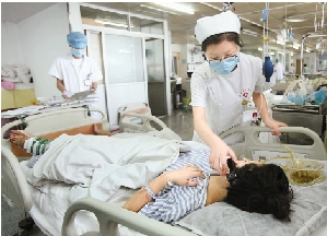受伤的乘务员王佩在护士的帮助下向家人报平安。