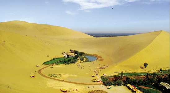 这是7月25日拍摄的依偎在鸣沙山怀抱中的月牙泉。据统计数据显示,过去15年间,甘肃省敦煌市月牙泉周边鸣沙山东山、南山山脊向月牙泉移动了8至10米,南北两山间的区域面积缩减了7%;和上世纪70年代相比,月牙泉四周沙山坡脚移动了13至60米,被称为“沙漠奇观”的月牙泉面临着沙山掩泉的威胁。 新华社发