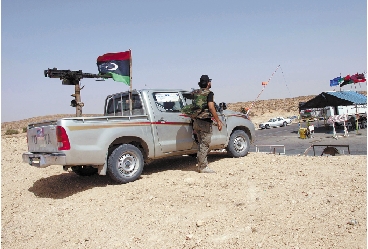 7月24日,利比亚杰贝尔·纳福萨山区的纳鲁特,通往突尼斯边境的一个利比亚反对派的检查站。这个检查站监视着难民的外流,以及从的黎波里逃出来的新兵。