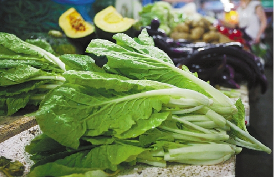 应季蔬菜大量上市,加上客家菜来浙数量增加,带动蔬菜批零价格回落,其中,茄子、油菜、苦瓜、丝瓜降幅最大,在一成以上。图为7月26日,杭州市民在屏风街农贸市场选购绿叶蔬菜。