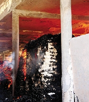 7月25日,利比亚首都的黎波里以东兹利坦镇的一间粮仓被烟雾和火焰包围。利比亚政府说,北大西洋公约组织战机当天空袭首都的黎波里以东兹利坦镇,炸死7人,摧毁粮仓和医院。