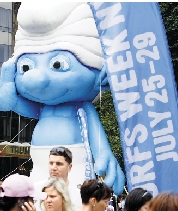 7月25日,纽约“蓝精灵周”开幕,立体的“蓝精灵村庄”出现在美国纽约哥伦布环岛,为3D影片《蓝精灵》造势。 新华社发