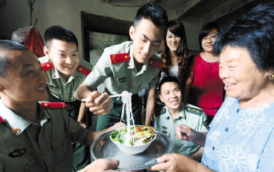 7月27日,台州市路桥区黄琅边防官兵把刚烧好的“长寿面”,送到拥军老妈妈吴荷香手中,祝愿她生日快乐。 王保初 摄