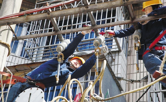 7月28日,上虞电力抢修队在市区胜利路更换供电设备。为让周边数千家营业房和居民家庭用电不受影响,抢修队员采用先进的带电作业法,使故障设备上方的10千伏高压线路依然保持供电状态。 金敖生 陈秋娣 摄
