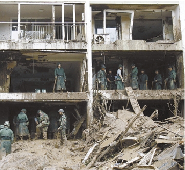 7月28日,在韩国首尔,士兵在被泥石流冲毁的建筑内清理淤泥。据韩国媒体当日报道,韩国首尔及全国大部分地区从26日下午开始遭到暴雨袭击,部分地区累计降雨量超过600毫米。目前,暴雨已造成40多人死亡,另有多人失踪。