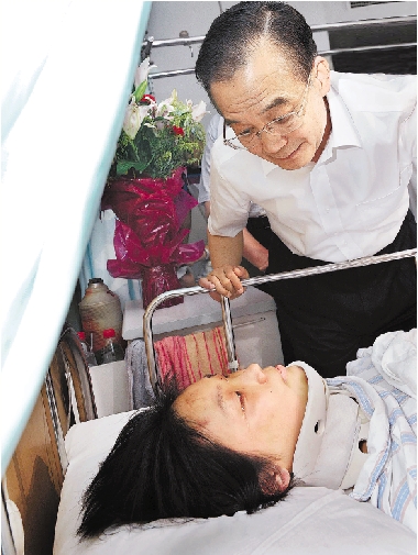 温家宝总理在温州第二人民医院看望“7·23”甬温线特别重大铁路交通事故中的伤员。 本报记者 黄曙林 李震宇 摄