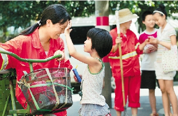 7月28日,杭州气温高达37℃。古东社区组织近20名小朋友,带上防晒霜和凉茶,为在小区工作的清洁工送去清凉。 通讯员 戚晓晴 本报记者 吴煌 摄