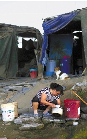 吴师傅的妻子在洗菜、做饭。