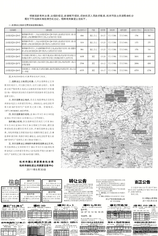 五、本次挂牌出让详细资料请参阅挂牌出让文件。有关挂牌出让文件资料可于2011年9月9日起到杭州市余杭区公共资源交易中心(余杭区临平南大街265号时代广场市民之家三楼)L8号窗口索取。