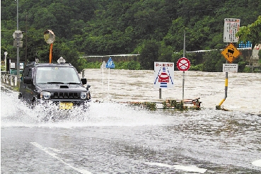 9月3日,在日本西部的德岛,一辆汽车驶过被洪水淹没的公路。 新华社发