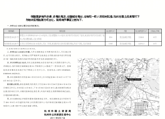 五、本次挂牌出让详细资料请参阅挂牌出让文件。有关挂牌出让文件资料可于2011年9月15日起到杭州市公共资源交易中心(杭州市钱江新城新业路311号市民中心L楼3楼)7号土地交易窗口索取。