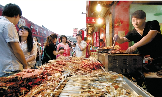 在济南市芙蓉街,一家烧烤店老板在忙活(9月3日摄)。 新华社记者 郭绪雷 摄